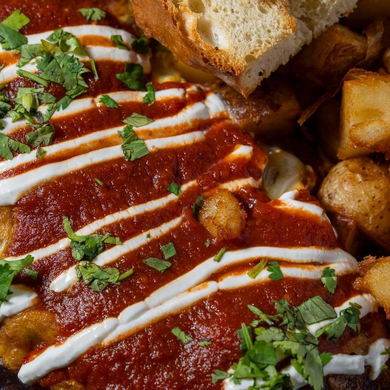 Shredded pork tossed in smoked chili sauce with peppers and onion. Topped with 2 eggs any style, sour cream, cheddar, and Jack cheese. Served with Cuban toast.