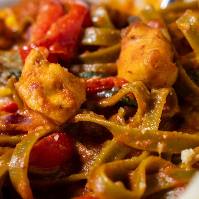 Mixed vegetables, smoked chipotle cream sauce tossed with spinach fettuccine.