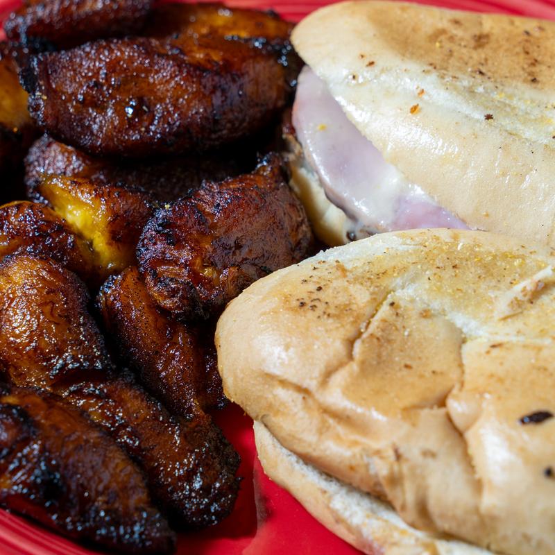 Thick sliced marinated pork, hand-cut hickory smoked ham, Swiss cheese, mustard, and pickles on a pressed hoagie roll. Served with plantains.