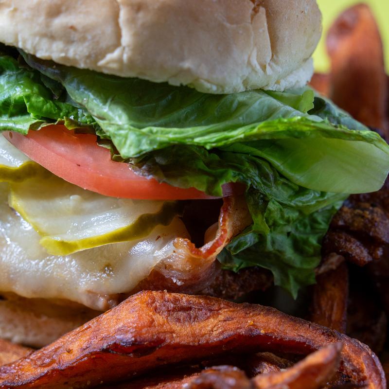 Veggie patty with avocado, pepper jack cheese, lettuce, tomato, onion, pickle, and mayo.