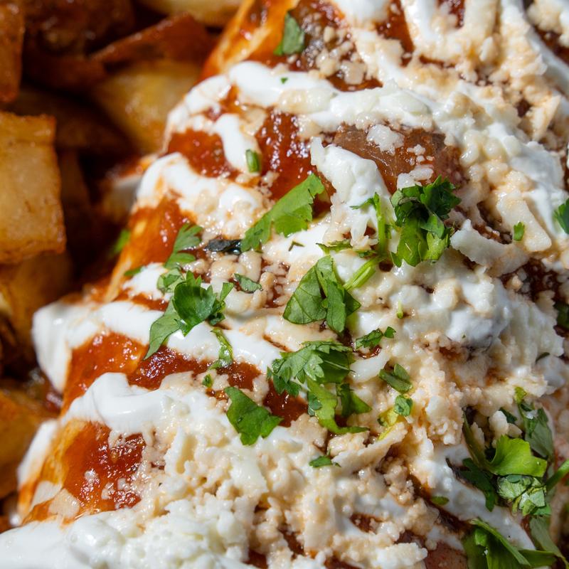 Scrambled eggs, chorizo, jack cheese, and refried beans. Topped with ranchero sauce, sour cream, and queso fresco. Served with home fries.